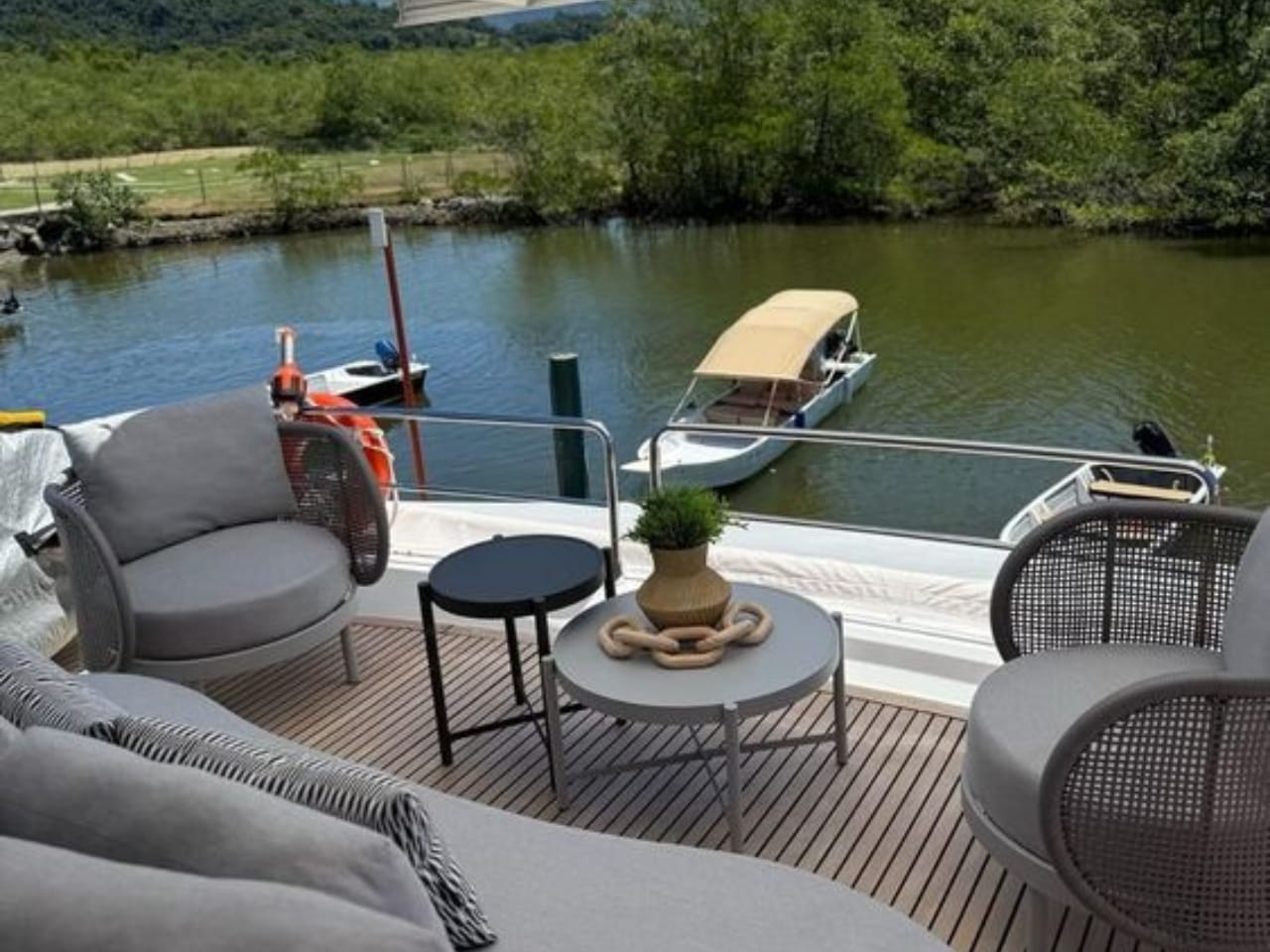 Seu projeto moderno conta com amplo flybridge coberto por hard-top, ideal para lazer e convivência social. Possui acabamento em teka completa, espaços internos sofisticados e totalmente climatizados, além de eletrônica de navegação avançada com GPS e radar. Para maior estabilidade em qualquer condição de mar, vem equipada com 2 Seakeeper, garantindo navegação suave e confortável.