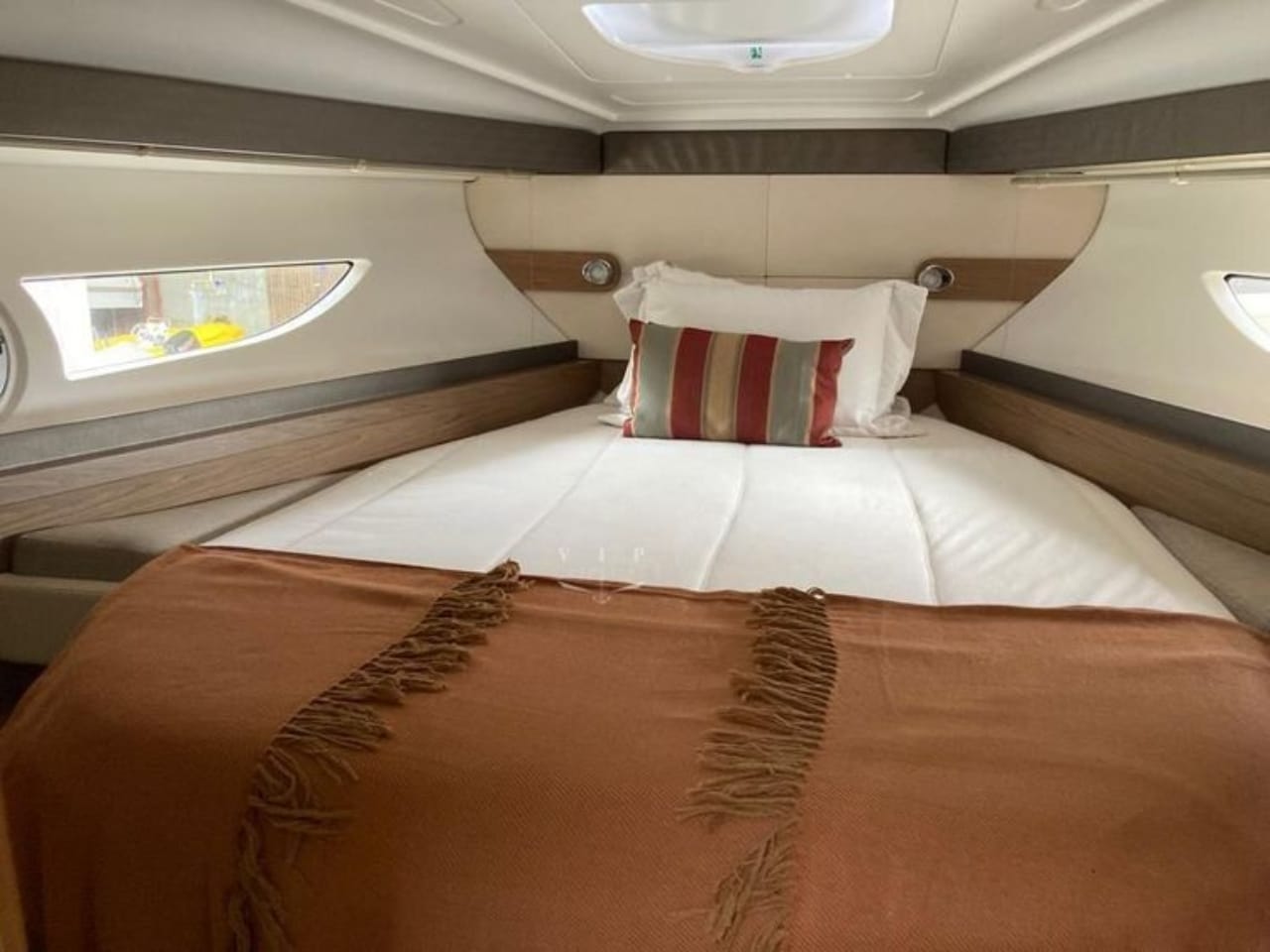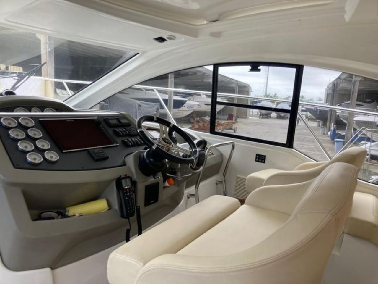 O interior oferece conforto total, com ar-condicionado, gerador, cozinha completa com armários, fogão elétrico 2 bocas, geladeira, cuba com água quente e fria, além de mais uma geladeira no deck de circulação. O salão e as cabines são equipados com 3 TVs, som, iluminação planejada, defletor de radar, luzes de navegação, luz Strobolight e luzes de fundo, criando um ambiente elegante e funcional para lazer prolongado a bordo.