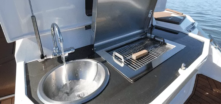 Além disso, em barcos maiores, é possível incluir um forno compacto ou micro-ondas, ambos fixados à estrutura.