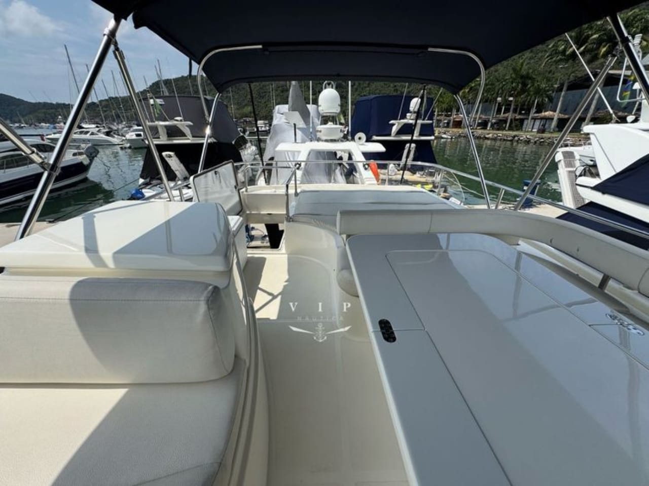 Com equipamentos de ponta, como GPS Raymarine, radar, piloto automático, bow thruster e estação meteorológica, proporciona total segurança e praticidade na navegação. Seu interior refinado conta com acabamentos premium, cozinha completa com eletrodomésticos modernos e sistema de entretenimento de alto padrão.
