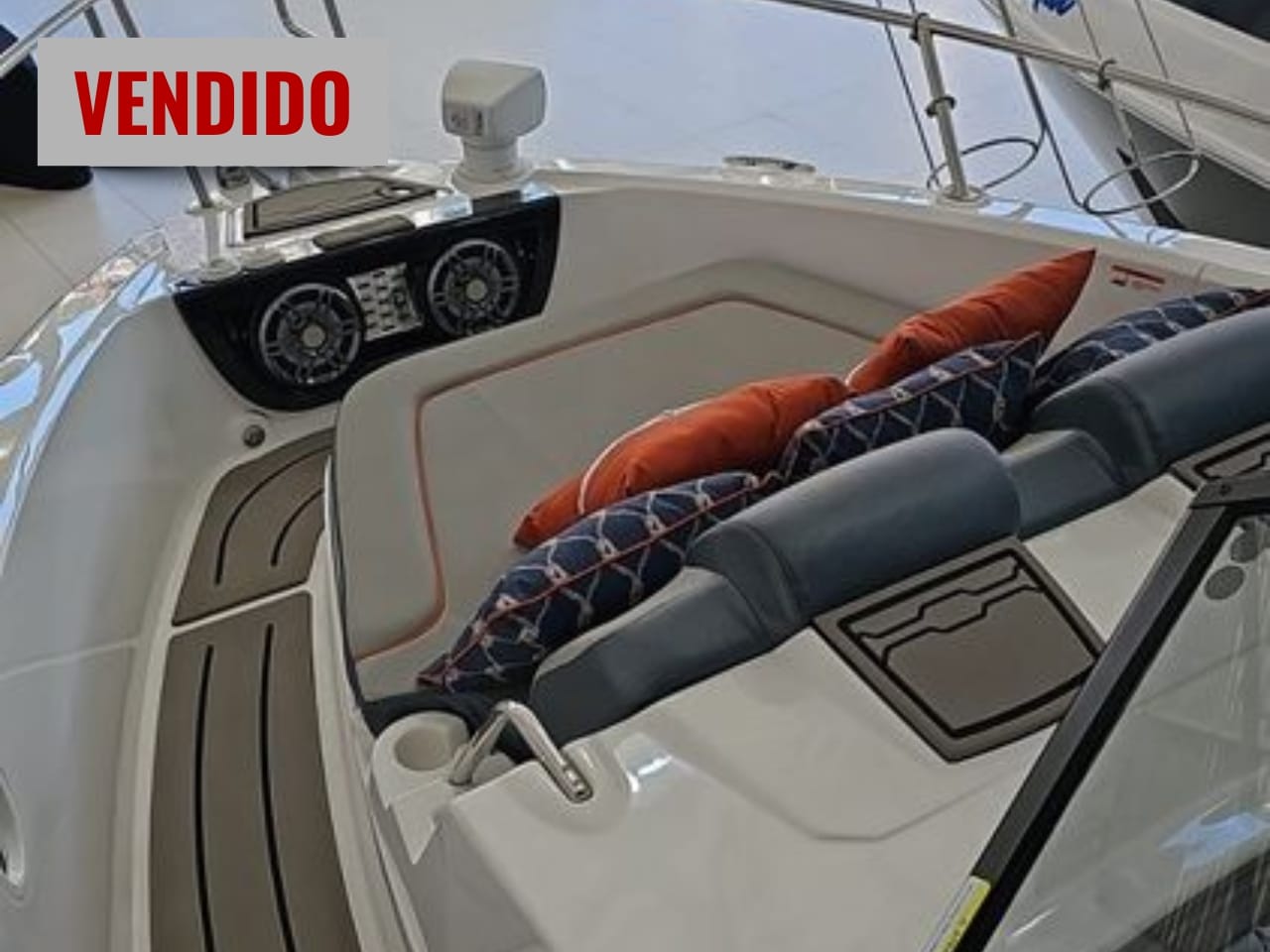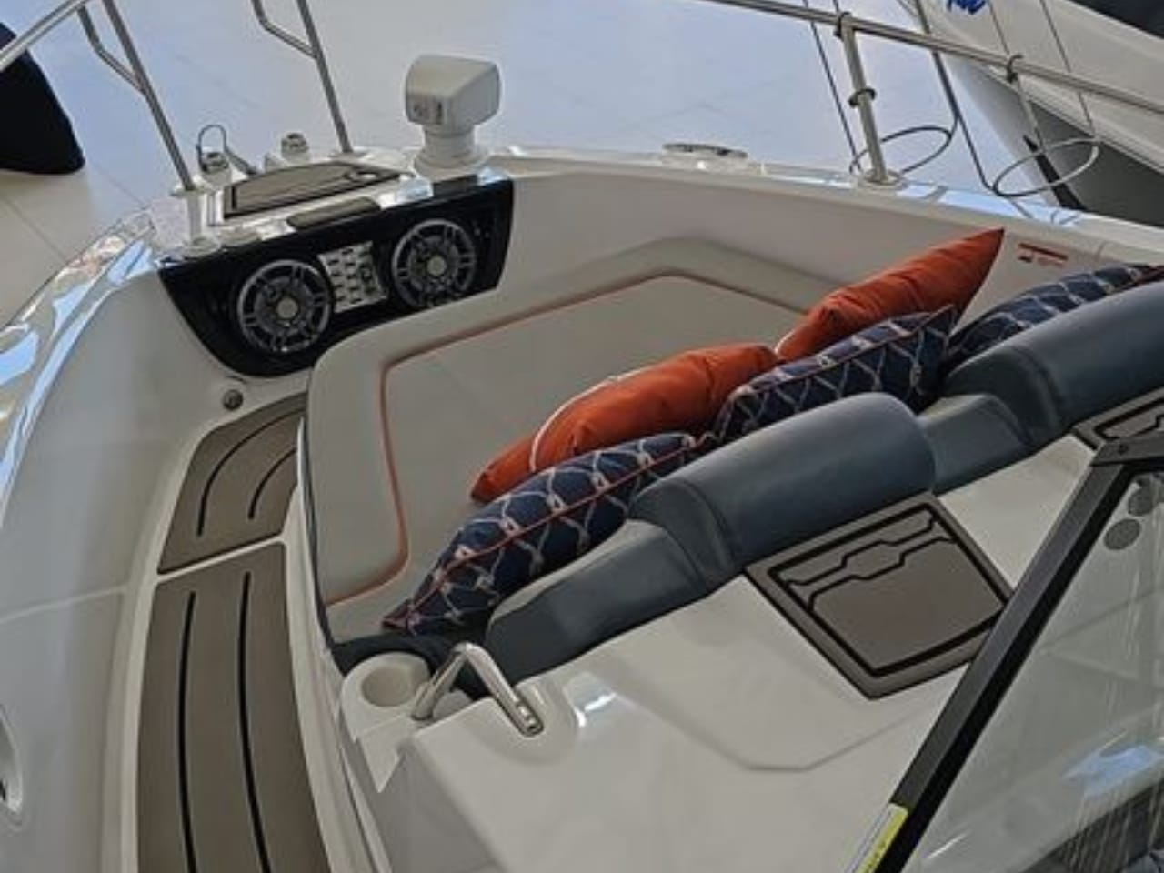 Além disso, dispõe de guincho elétrico de 800W com corrente de 40m, âncora Bruce de 10 kg, carregador por indução, refrigerador, placa geleira, armário superior no BWC, torneira de convés e kit de tapete EVA cinza no deck. O conjunto garante praticidade e autonomia, ideal para quem deseja aproveitar cada momento no mar.